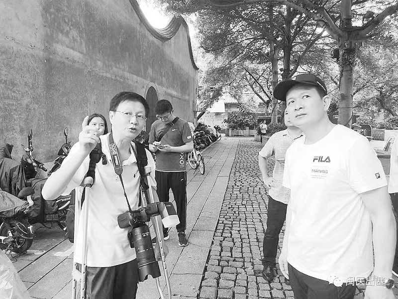 2021年7月,应省卫健委要求,史鲁闽(左)为第19批援塞内加尔医疗队队员培训摄影。当时,他腿伤初愈,还拄着双拐
