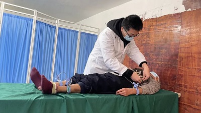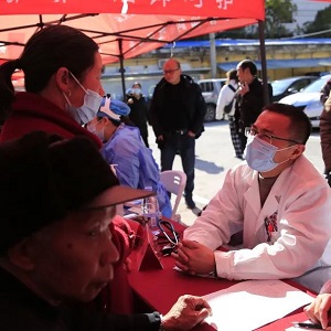 一位独坐在石头台阶上的老奶奶引起了医护人员的关注,主动上前询问情况,志愿者用当地话和老奶奶沟通后得知,老人家已经99岁高龄了,想找医师看看胳膊酸痛的问题。骨科许玮主任医师闻讯,穿过人群来到老奶奶身边为她查体,他感慨的说老奶奶是他接诊过的年龄最大的患者了,近百岁的高龄,还可以自己拄着拐杖出行,实属不易。