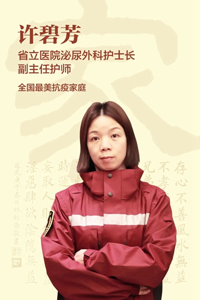 2020年,我将已经入选援鄂医疗队的消息告诉我的丈夫时,殊不知我的爱人,省立医院麻醉科的方闻医生,原来也已经第一时间报名参加援鄂医疗队了。他对我说:“穿了白衣战袍,就要当得起自己的责任,之前2014年到2017年我去非洲博茨瓦纳援外医疗,你支持我,现在轮到我支持你了!”带着家人对我的支持与叮咛,我毅然决然地踏上了援鄂之路!将家庭的小爱转换为医者的大爱、对自己初心使命的坚守和医者誓言的践行。