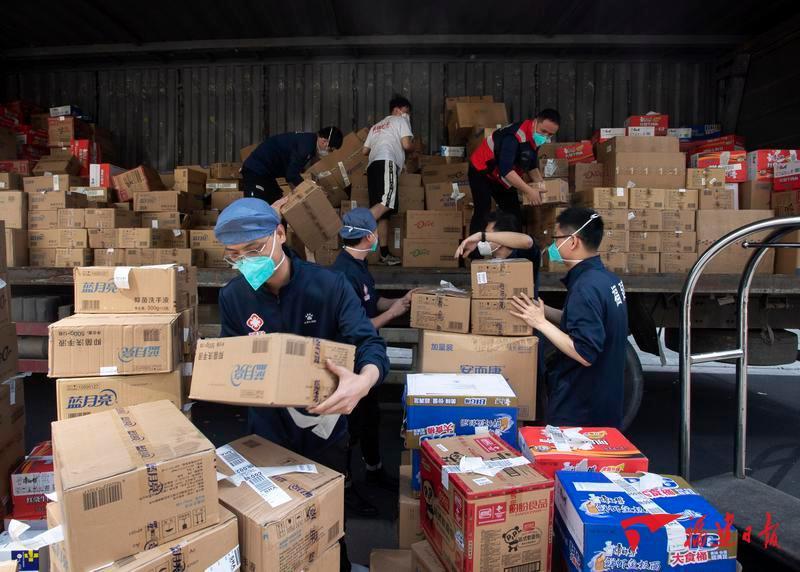 医疗队驻地,队员们卸载分配物资。从7日晚开始,防护物资和生活必需品陆续运抵医疗队上海驻地。