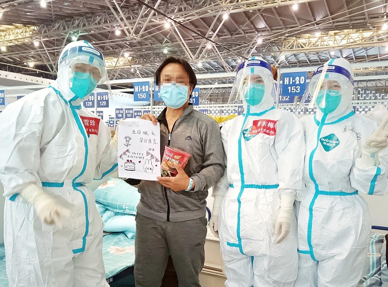 当得知舱内一位志愿者姐姐是4月19日生日,并在当天出院,他便从住处带了一大袋食物,还制作了生日卡片送给她。这让志愿者姐姐非常惊喜和感动。