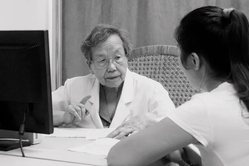 96岁高龄的陈文祯,依旧拄着拐杖,坚持每周三次的门诊,参加每周一次的科室病案讨论。