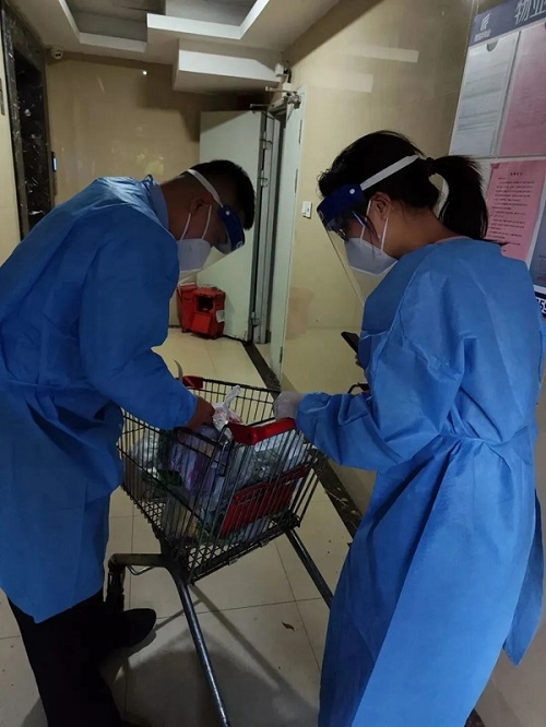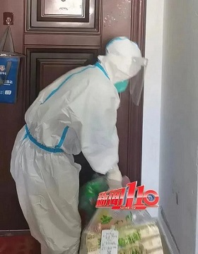 △茶园街道社区工作人员挨家挨户送生活物资,临走时不忘带走生活垃圾。