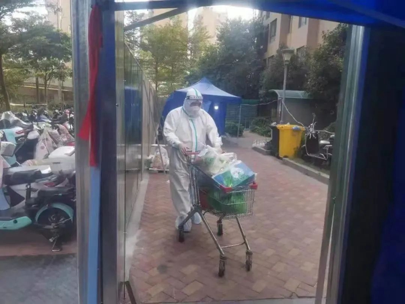既保证派送时效、又确保安全,对于小区内的中风险区居民,从下单到收货,至少经过三道派送——外卖小哥送至小区入口后,物业工作人员按地址分发送到每栋楼,每栋楼内再由身穿防护服的工作人员点对点送至家门口。