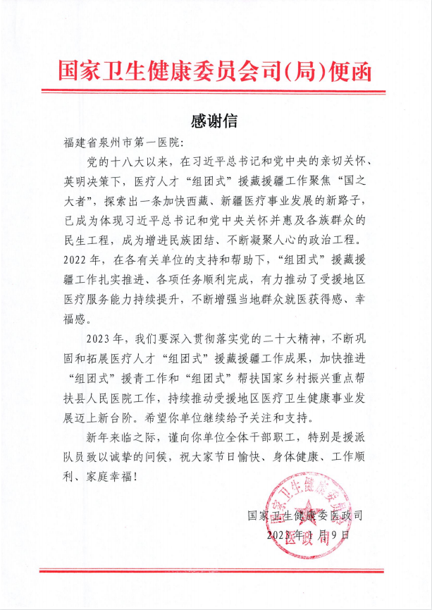 另一封感谢信中,则表示在一院及各有关单位的支持和帮助下,“组团式”援藏援疆工作扎实推进、各项任务顺利完成,希望2023年继续给予关注和支持,持续推动受援地区医疗卫生健康事业发展迈上新台阶。