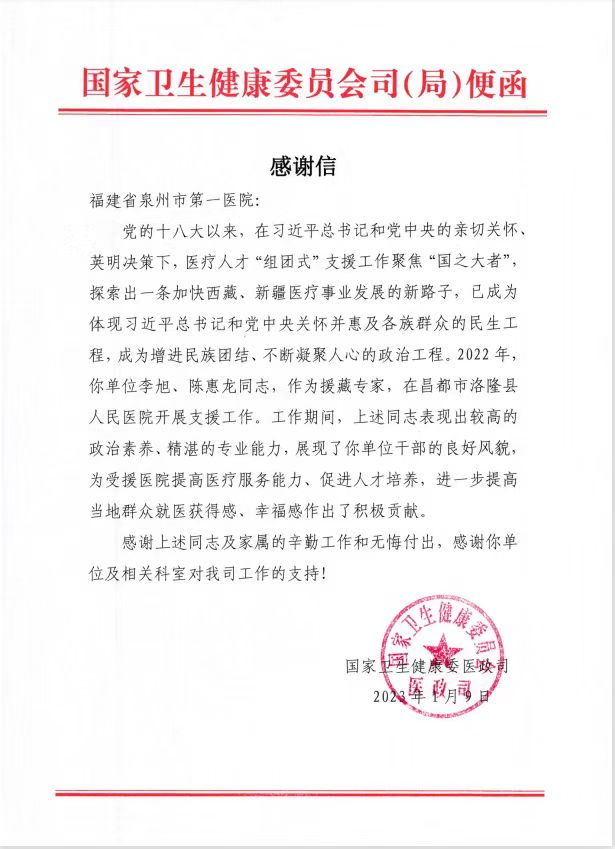 国家卫健委在感谢信中表示,2022年,李旭、陈惠龙同志,作为援藏专家,在昌都市洛隆县人民医院开展支援工作。工作期间,两人表现出较高的政治素养、精湛的专业能力,展现了泉州市第一医院干部的良好风貌,为受援医院提高医疗服务能力、促进人才培养、进一步提高当地群众就医获得感、幸福感做出了积极贡献。