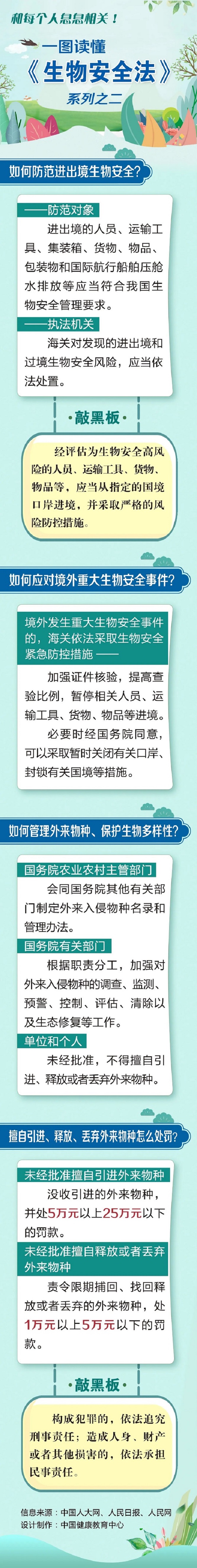 《中华人民共和国生物安全法》于2021年4月15日正式施行。为向公众普及生物安全相关法律法规和生物安全知识,提高全社会生物安全意识,维护总体国家安全,中国健康教育中心设计制作了“一图读懂《生物安全法》”系列手机长图,让我们一起来看看吧。