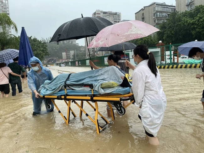 “一位孕26周的孕妇破水,立即出诊!”29日6时50分,接到福州120指挥调度中心通报后,福建省立医院南院急诊科的医护人员顶风冒雨,火速赶往该孕妇家中。由于孕妇家属不在,只有邻居陪同,医护人员一方面进行紧急处理,监测胎心和孕妇生命体征;一方面安抚孕妇有些焦虑的情绪,将她平稳安全送上急救车。暴雨导致路面积水,救护车不得已多次更换路线,并得到交警的全力协助。到达定点医院附近时,路面积水深达大腿,救护车无法通行,为了能及时送医,南院120医护和保安立即跳下救护车,用担架蹚水小心护送孕妇平安到达医院。