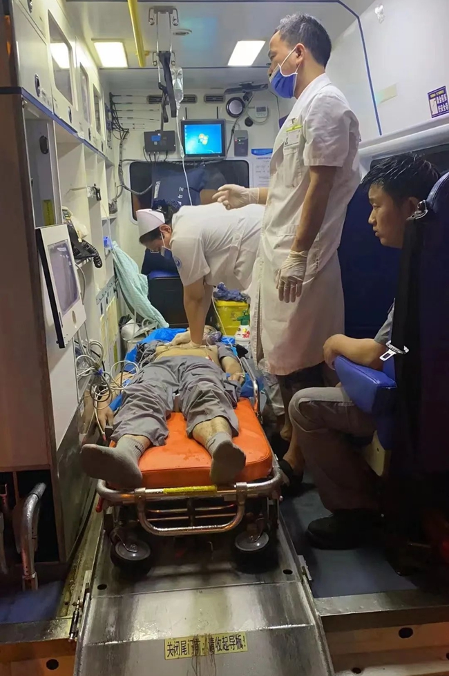 福建中医药大学附属人民医院急诊医务人员为一位高热惊厥的小病人施行过吸氧急救处理后,快速转运到医院治疗。