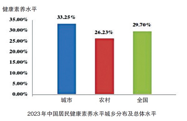 监测结果显示,2023年全国城市居民健康素养水平为33.25%,农村居民为26.23%,较2022年分别增长1.31和2.45个百分点。东、中、西部地区居民健康素养水平分别为33.30%、28.85%和24.44%,较2022年分别增长1.42、2.15和1.88个百分点。城乡居民基本知识和理念素养水平为42.00%,健康生活方式与行为素养水平为32.21%,基本技能素养水平为26.76%,较2022年分别提升0.74、1.58、0.76个百分点。6类健康问题素养水平由高到低依次为:安全与急救素养(59.33%),科学健康观素养(54.71%),健康信息素养(41.05%),慢性病防治素养(30.43%),基本医疗素养(28.84%),传染病防治素养(28.02%)。