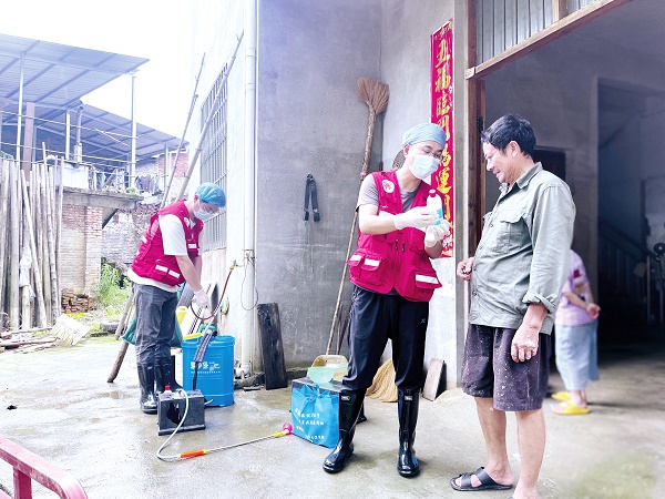 6月19日,福建省南平市建阳区麻沙镇中心卫生院医务人员深入扁溪村,指导受灾村民开展科学消杀。