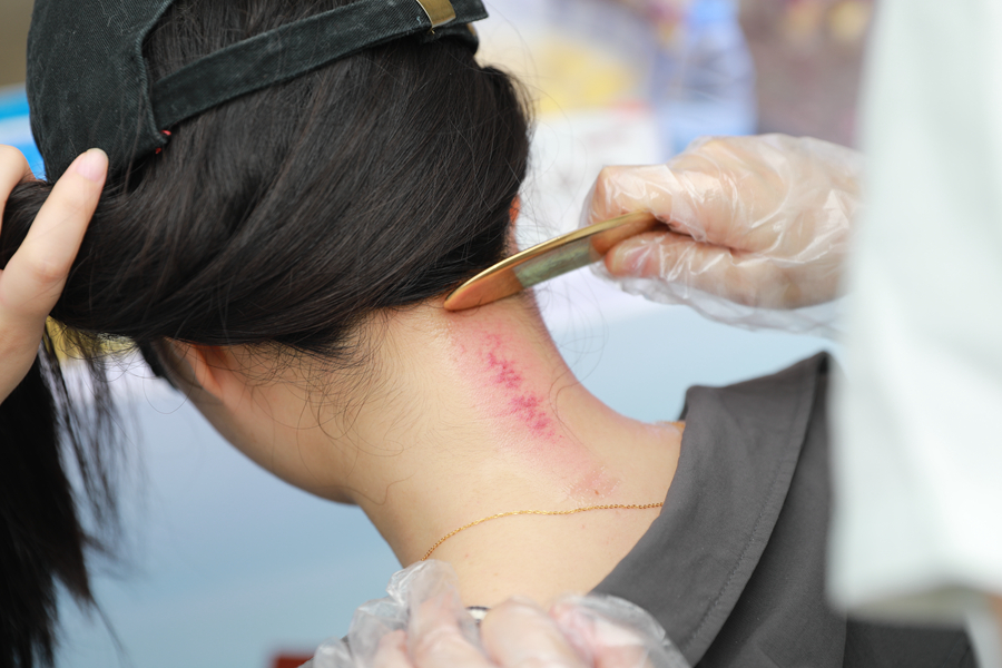 精油薄涂,铜砭刮之,寥寥数下,紫红的痧便在颈间浮现。有的是“湿气”,有的是“火气”,不少慕名而来的大学生龇牙咧嘴地体验中医适宜技术,体验结束后大呼一句“好爽”。