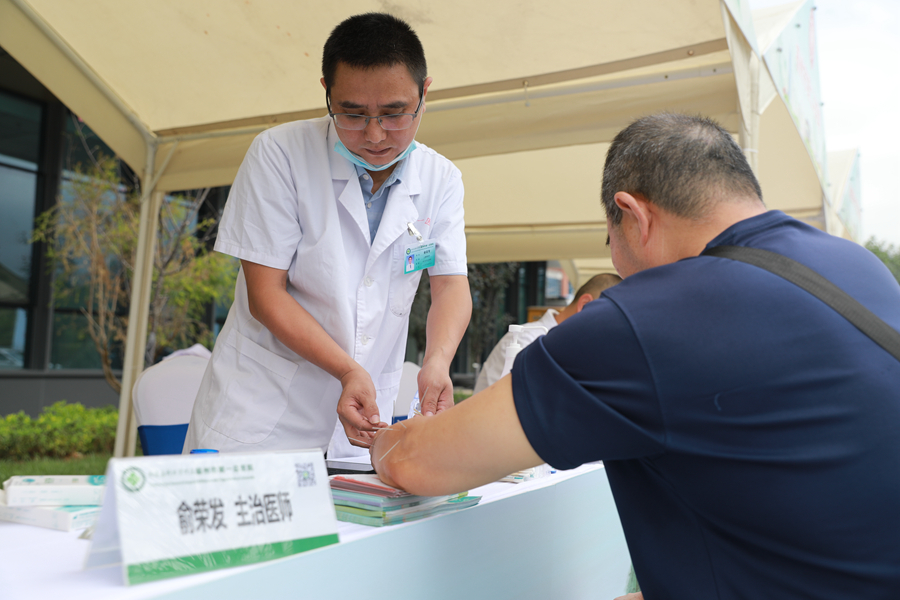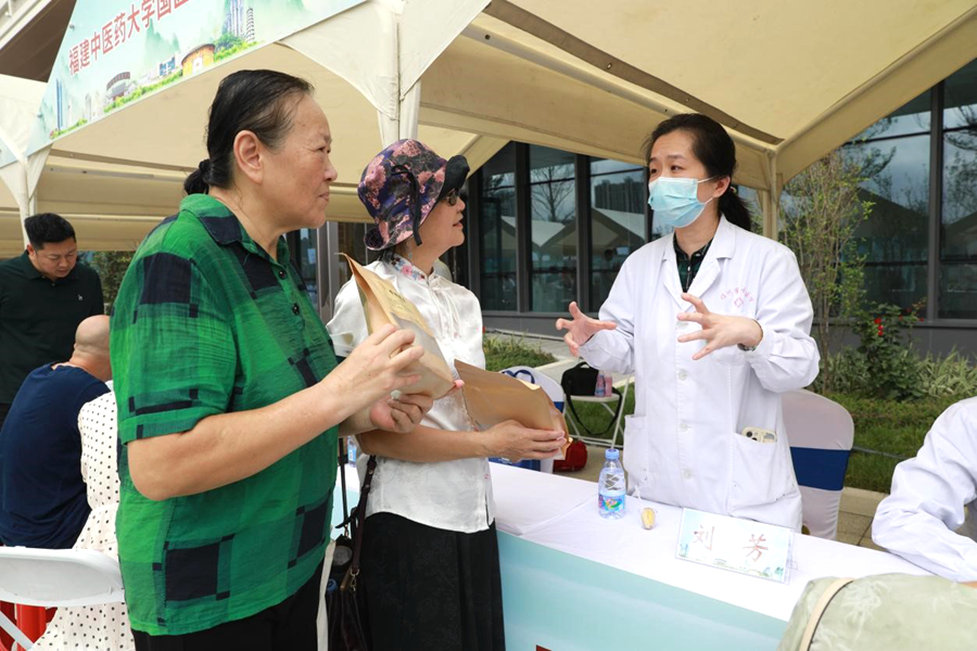 “要注意保暖”“平常不要想太多”“脾虚要注意滋补”“肝火太旺少熬夜”……展位上,来自福州市中医院等10家在榕具有中医药影响力的医疗机构医师们边唠家常,边施技诊疗。活动现场药香氤氲,艾灸、拔罐、指压等“养生标配”引得许多市民争相排队体验。