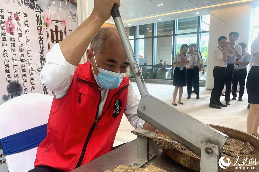 省级中医药文化宣传教育基地代表现场演示中药材炮制。人民网记者 林盈摄