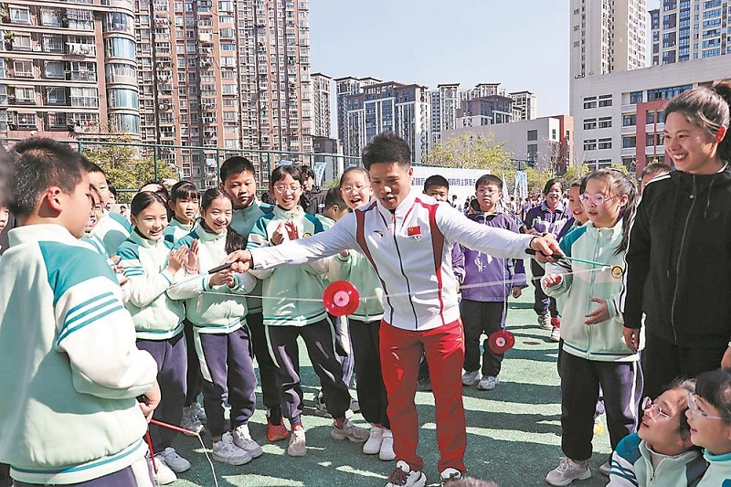 福建省儿童青少年近视防控公益宣传大使、奥运冠军李发彬参与大课间抖空竹游戏。