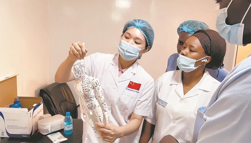 庄晨在通亚姆尼亚久儿童医院进行针灸疗法临床带教。