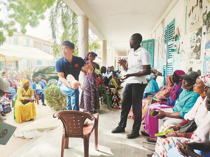 中国(福建)第20批援塞医疗队麻醉科医生张文清为候诊群众开展海姆立克急救技能培训。(受访者供图)