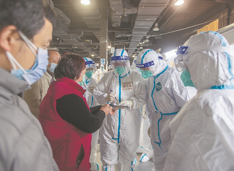 1日,上海城市足迹馆亚定点医院,福建援沪医疗队队员在巡床时记录患者的询问及要求。