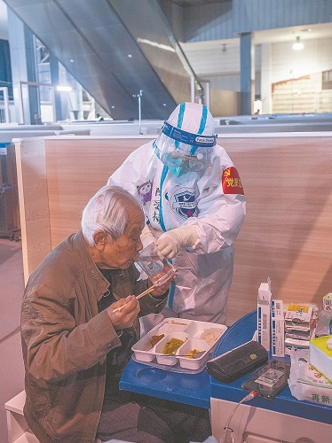 1日,上海城市足迹馆亚定点医院,福建援沪医疗队队员陈爱楠照顾一位抗美援朝老兵患者用餐。