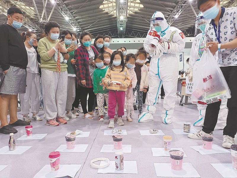 1日,在上海世博方舱H1舱区内,福建援沪医疗队队员与“舱友”、工作人员们一起玩起了“套圈圈”游戏。