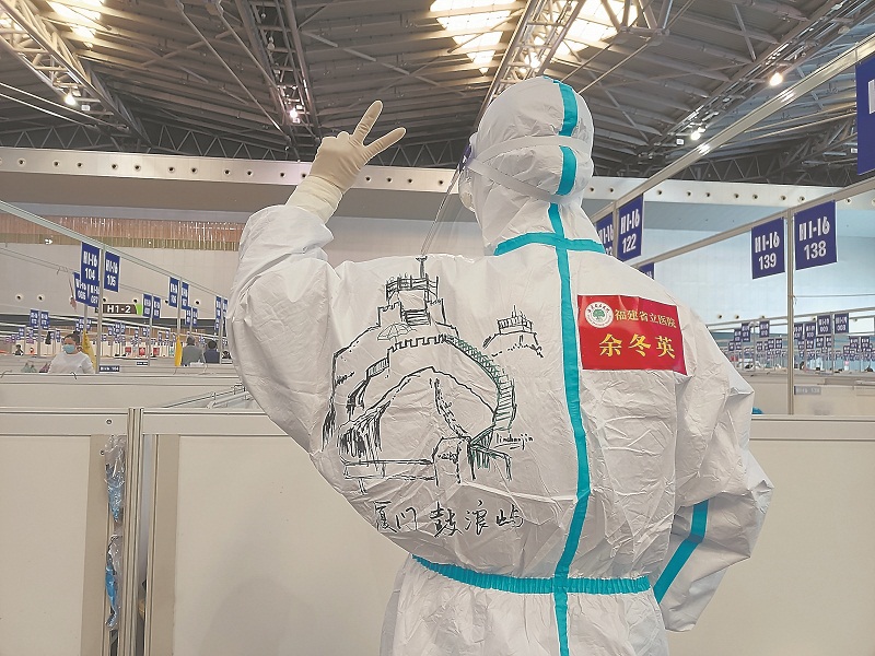 当天,来自福建省立医院的援沪医疗队队员还在防护服上画上了福建的地标建筑,有镇海楼、三坊七巷、福建土楼、鼓浪屿等等,离家20多天的他们,以此寄托思乡之情,也向上海的“舱友”们介绍了福建的人文景观。