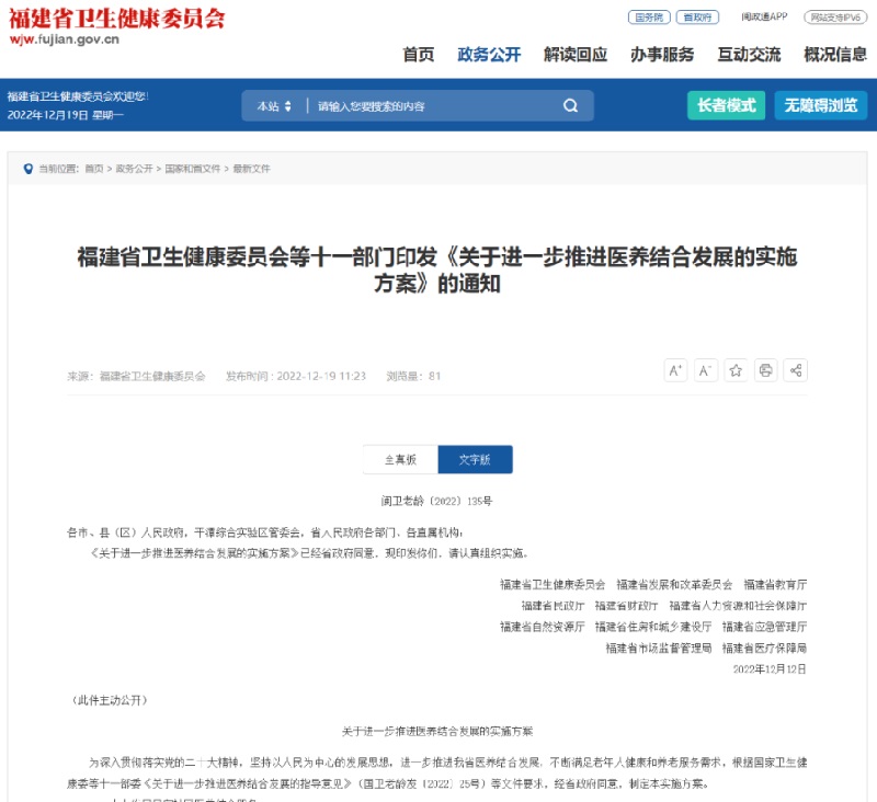 为深入贯彻落实党的二十大精神,坚持以人民为中心的发展思想,进一步推进我省医养结合发展,不断满足老年人健康和养老服务需求,福建省卫生健康委员会、福建省发展和改革委员会、福建省教育厅等十一部门印发《关于进一步推进医养结合发展的实施方案》。