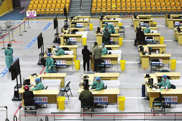 12月28日,福建省福州市,市民在城市中心发热门诊就诊。日前,福州市在晋安区体育馆新建一家城市中心发热门诊。该门诊医疗管理服务团队由福州市第一医院组成,配备有自动叫号系统、自助机、药房等,主要为14至65岁无基础疾病的发热患者提供非急诊的对症诊疗服务,单日最多能满足3000人就诊。