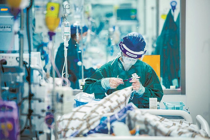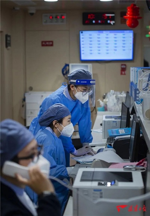 ▲21日,重症医疗科,吴文伟与同事一起为一位新冠重症患者做检查治疗。