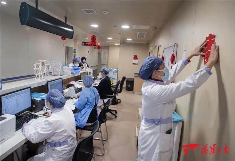 ▲1月21日,福医协和旗山院区亚重症病区,副护士长黄剑珠正布置护士站的新春氛围。