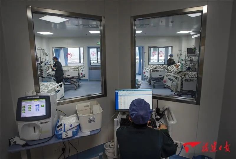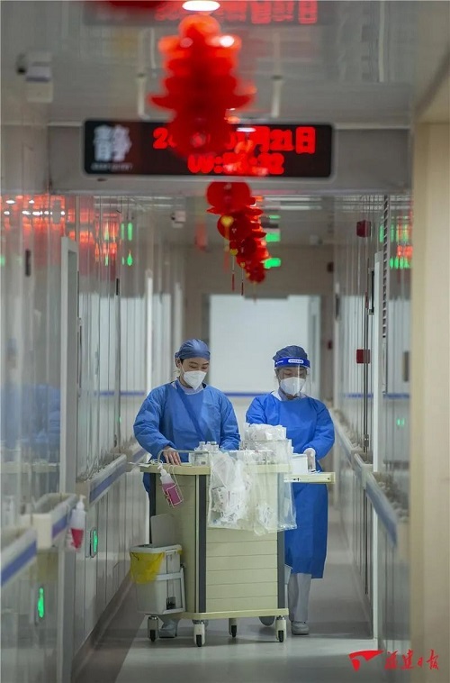 ▲1月21日,福医协和旗山院区亚重症病区,护士们推着治疗车在病房巡查。