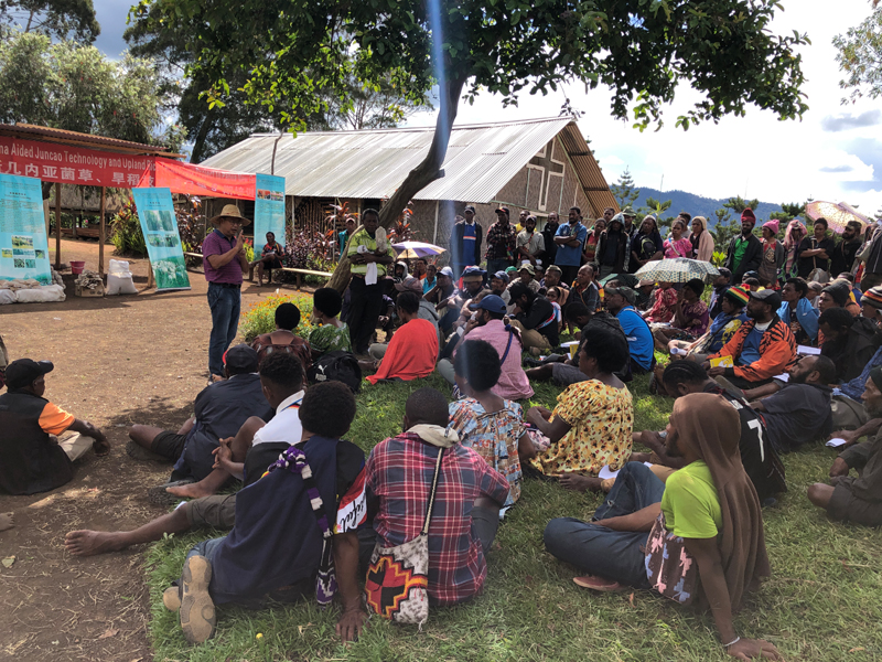 中国援巴布亚新几内亚菌草旱稻项目专家组组长林应兴(戴草帽者)在巴布亚新几内亚东高地省中国援助巴新菌草和旱稻技术项目第9期培训班上授课(2020年12月15日摄)。新华社发