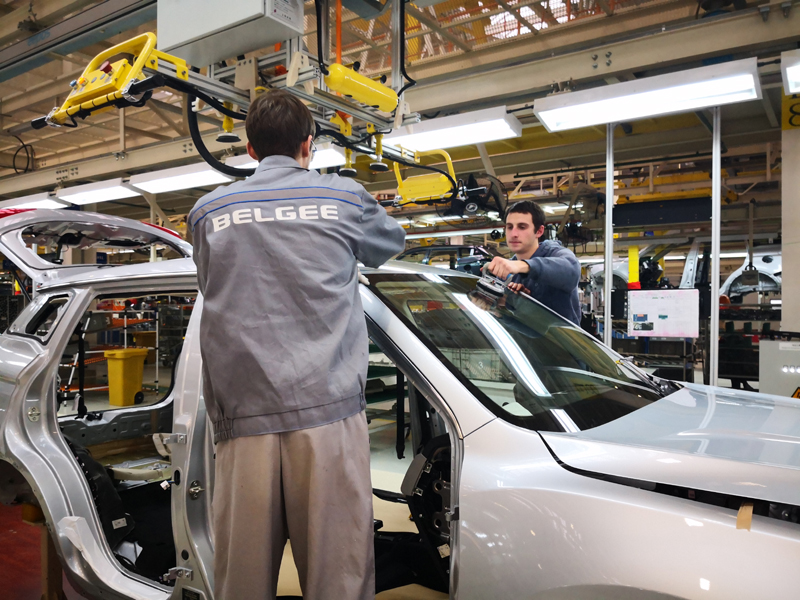 在白俄罗斯首都明斯克东北方向50公里处的白俄罗斯吉利全散件汽车制造厂总装车间,工人在组装车体(手机照片,2018年12月1日摄)。新华社记者 张若玄 摄