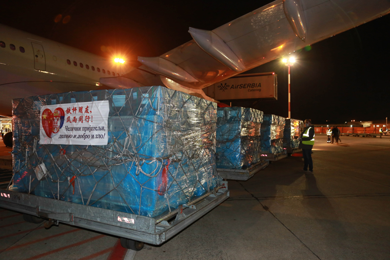 在塞尔维亚首都贝尔格莱德,写有 “铁杆朋友,风雨同行”字样的中方捐赠医疗物资从飞机上卸下(2020年3月21日摄)。新华社记者 石中玉 摄