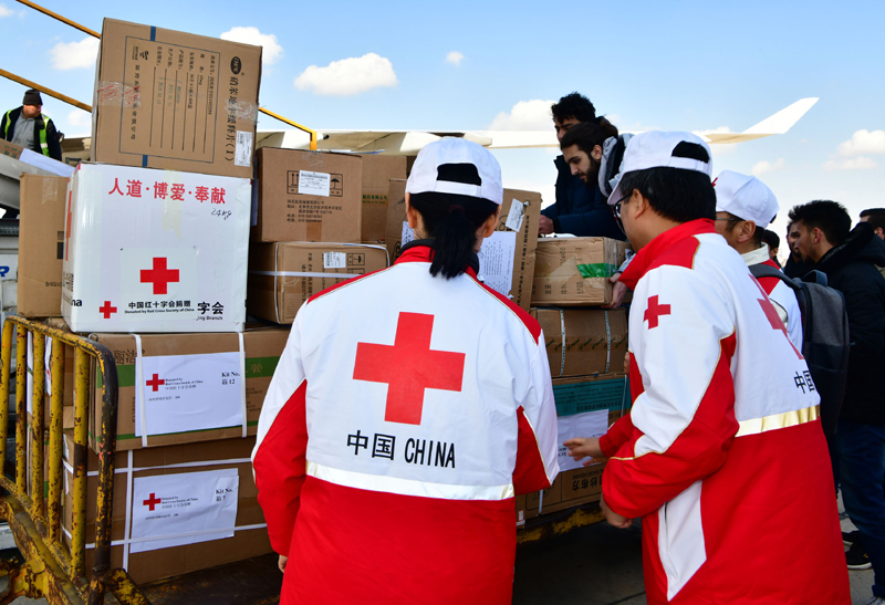 工作人员在叙利亚大马士革国际机场卸载中国红十字会援助的人道主义物资(2023年2月13日摄)。新华社发(阿马尔·萨法尔贾拉尼 摄)
