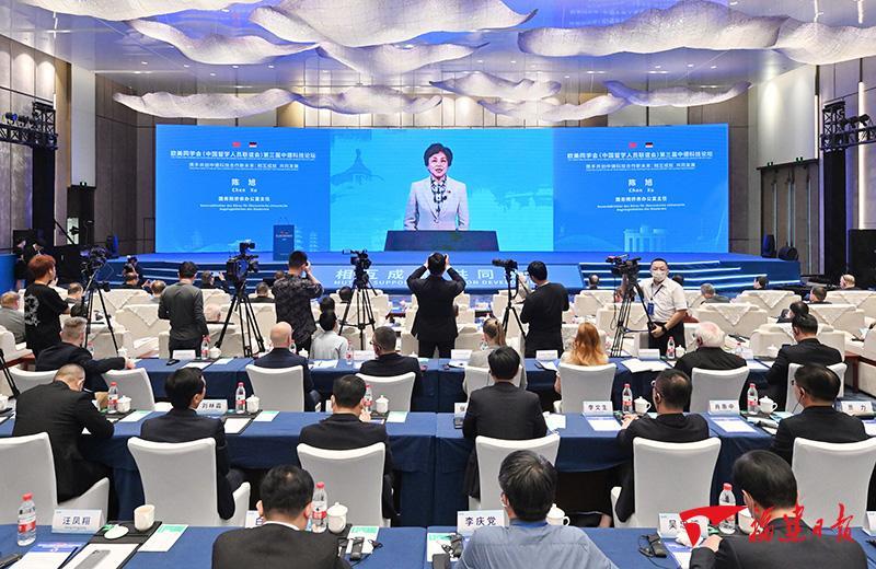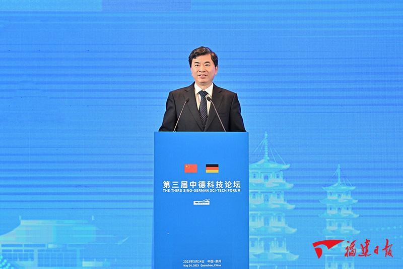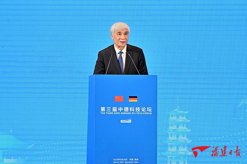 24日,第三届中德科技论坛在泉州开幕。全国人大常委会副委员长、民盟中央主席、欧美同学会(中国留学人员联谊会)会长丁仲礼,省委书记、省人大常委会主任周祖翼,国务院侨务办公室主任陈旭在开幕式上致辞。