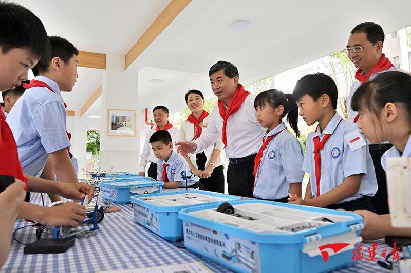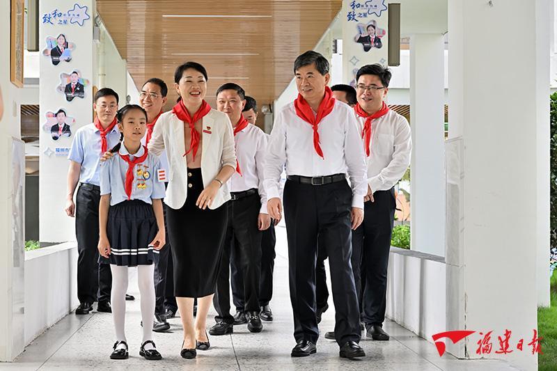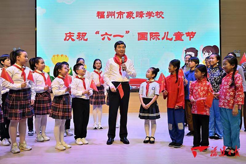 福州市象峰学校创办于1929年,近年来不断优化教育资源,教学质量稳步提升。节日的校园朝气蓬勃,处处欢声笑语,孩子们愉快地参加丰富多彩的活动。周祖翼走进校园,详细了解少先队学习党的二十大精神活动情况,与孩子们一起参加主题队日活动,饶有兴致地看大家展示科技小成果、烹饪技术和鸟类保护项目学习成果等,参观了学生们的国风书画和扎染等传统艺术作品,并观看了红色情景剧“跨越百年的初心”。周祖翼和孩子们互动交流,为他们的精彩表演点赞,与大家共同欢度节日。