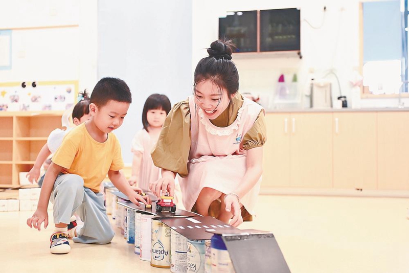 一个个奶粉罐堆叠,没多久便成了“大厦”;几个孩子合力,一座“城市”慢慢有了雏形。7月21日,在福建省国资教育托育园(东街园)里,孩子们正在照护师的指导下发散着想象力。在这个童趣十足、配套设施齐全的托育园里,气氛十分温馨,2岁的桐桐每天和小朋友一起学儿歌、玩游戏,享受着快乐的童年时光。