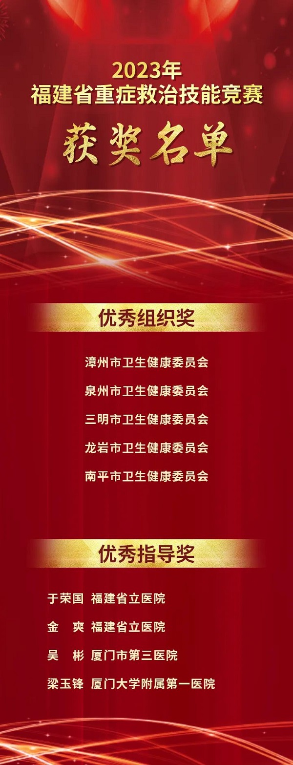 为全面提升我省医疗机构重症救治能力,由省卫健委、省总工会指导,省医师协会、省医学会和省护理质控中心联合举办,福建医科大学协办的“福建省2023年重症救治技能竞赛”在福建医科大学临床技能教学中心举办,竞赛分别于5月5日至7日、7月30日至8月1日开展单项技能赛、基础理论笔试、团体比赛三个环节,来自省属医疗单位与各地市医疗单位23支代表队228名选手参加决赛,此次比赛共产生了11个奖项。