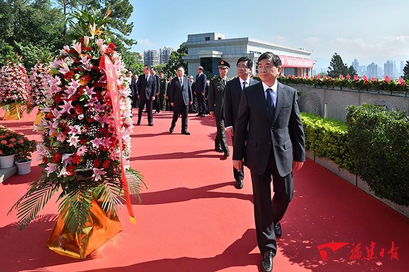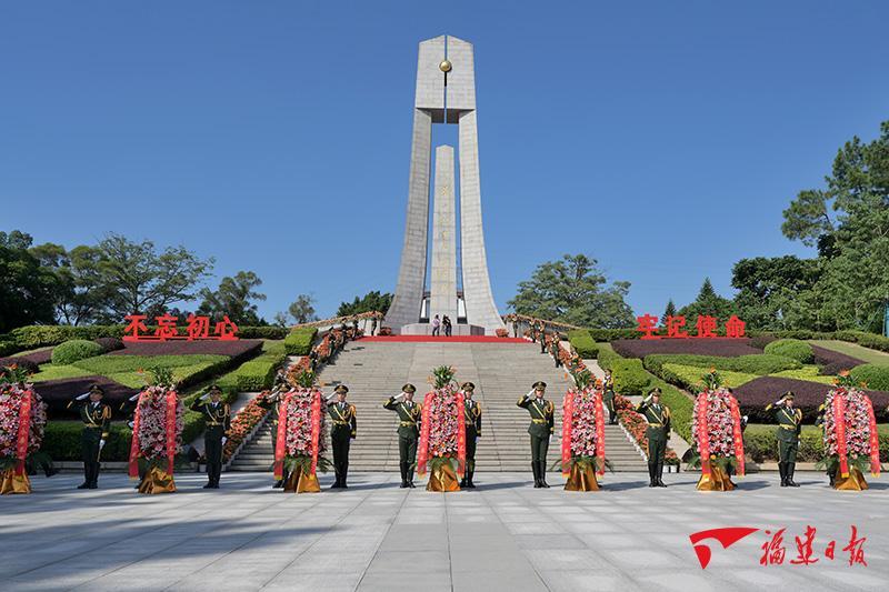 浩气存天地,青山护忠魂。秋日金晖中,苍松翠柏环绕的文林山革命烈士陵园庄严肃穆,革命烈士纪念碑巍然屹立。广场台阶前,以省委,省人大常委会,省政府,省政协,驻闽解放军和武警部队官兵,省各民主党派、工商联和无党派人士,省各人民团体和省、市各界群众,老战士、老同志和烈士亲属,全省少先队员名义分别敬献的9个花篮一字排开,花篮红色缎带上书写着“革命烈士永垂不朽”的金色大字。