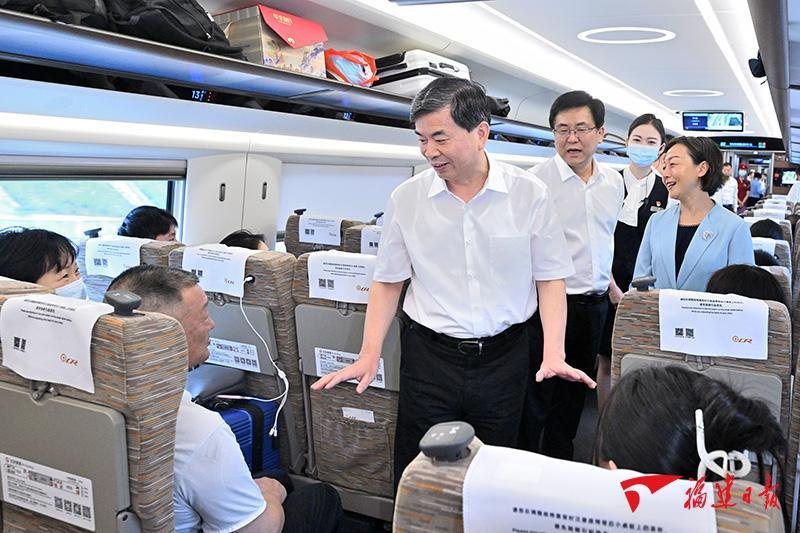 银龙驰山海,福厦若比邻。新开通的福厦高铁最高时速按350公里运营,福州至厦门最快55分钟可达,形成福厦“一小时生活圈”和厦漳泉“半小时交通圈”。省领导一行从福州南站上车,“复兴号”高铁列车一路飞驰,车窗外山川田野、城镇村庄倏然而过,车厢内宽敞整洁、座无虚席。周祖翼、赵龙认真察看列车设施及安全设备等,看望司乘人员、与旅客交流。“车票好买么?是通过网络还是窗口购买?”“是外出旅游还是回家探亲?”周祖翼十分关注旅客的乘车感受,询问设施是否便利、服务是否满意,并祝大家旅途平安、节日快乐。在听取福厦高铁总体情况及后续运营计划介绍后,周祖翼强调,要积极推进交通先行、交通聚力、交通赋能,加快打造现代化综合立体交通体系,提高综合交通效率,更好促进沿线地区经济发展、满足群众出行需求。