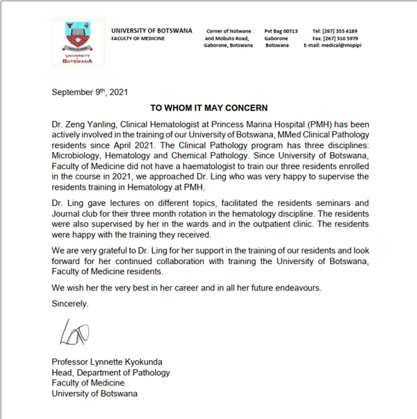曾雁玲就着手培训公主玛丽娜医院内科年轻医生操作,先后培训40名年轻医生,其中已有10余名医生可以独立完成操作。其次是组织实验室人员带教。博茨瓦纳大学医学部得知曾雁玲组建血液实验室的消息后,专门组织人员来医院参观见学,对这项工作非常认可,并致信邀请曾雁玲带教3名轮转医生。带教任务对英文要求比较高,曾雁玲的压力也很大,但一想到习近平总书记提出“不畏艰苦、甘于奉献、救死扶伤、大爱无疆”的中国医疗队精神,她毫不犹豫接受了这个挑战,她在工作之余精心准备高质量的课件,并将国内双向教学模式导入教学过程,轮转医生们在3个月的学习中,学到了实用的血液科知识和操作,反馈很好,在教师节前,博茨瓦纳大学医学部特意送上一封感谢信作为教师节的礼物送给她。