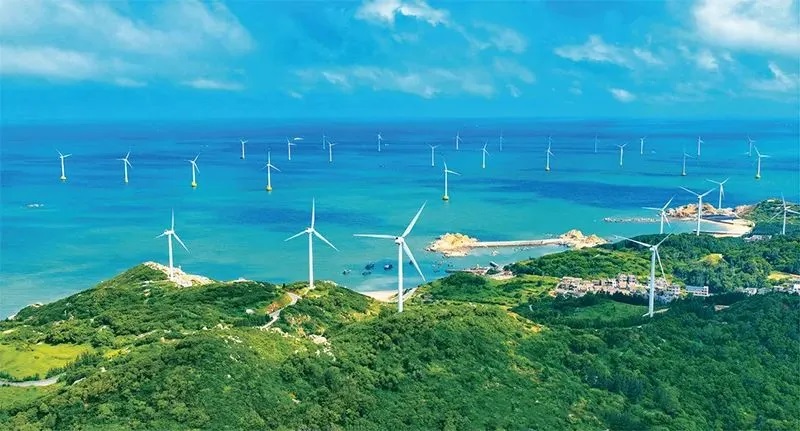 牢记“让绿水青山永远成为福建的骄傲”嘱托,福建着力打造绿色低碳产业和供应链,已经形成了包括风机、电机、叶片、钢结构件等完整风电产业链,生产的风电产品广泛应用于我国的海上风力发电。图为2024年7月13日拍摄的福建省平潭综合实验区北部生态廊道,一座座巨大的白色风机拔地而起。福建日报社供图 江信恒/摄