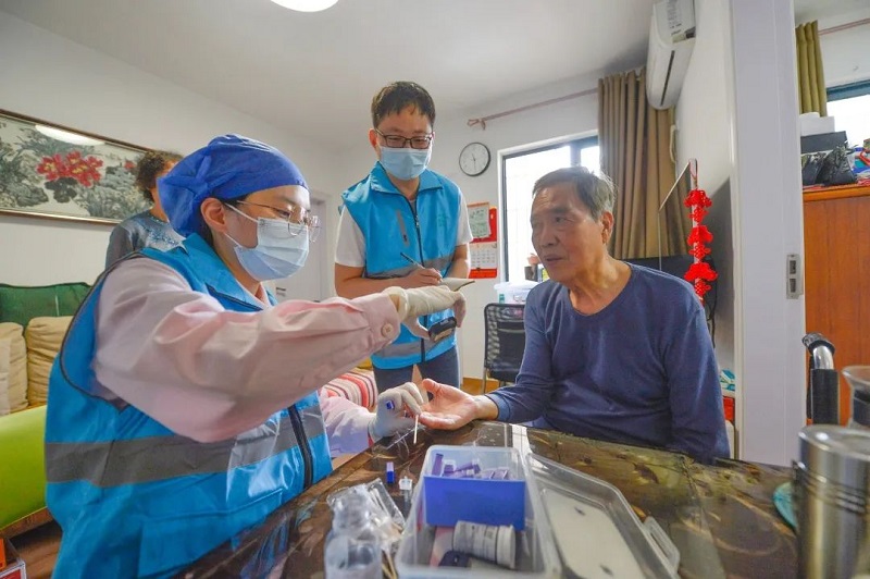 家庭医生上门为老人检测血糖。池远/摄