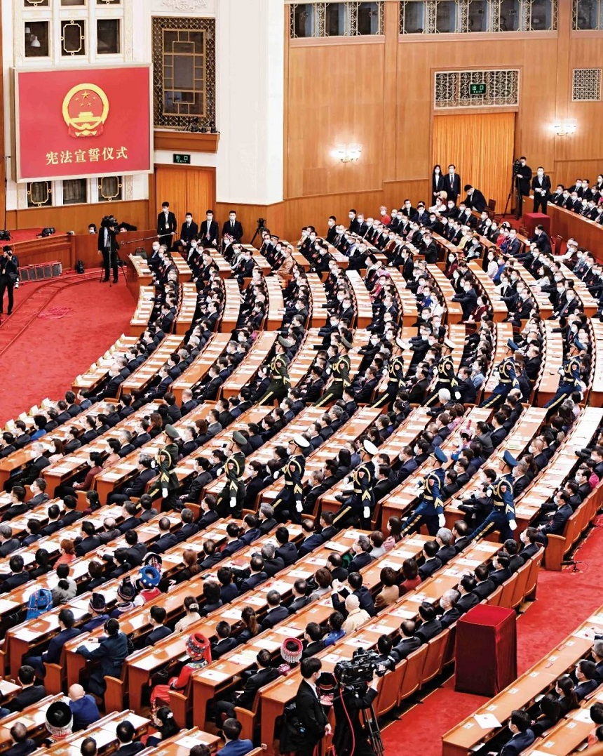 2023年3月10日,十四届全国人大一次会议在北京人民大会堂举行第三次全体会议。全体会议各项议程进行完毕后,举行中华人民共和国第十四届全国人民代表大会第一次会议宪法宣誓仪式。新华社记者 金皓原/摄