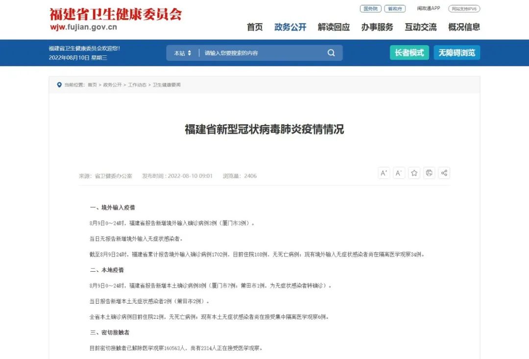 8月9日0~24时,福建省报告新增境外输入确诊病例3例(厦门市3例)。