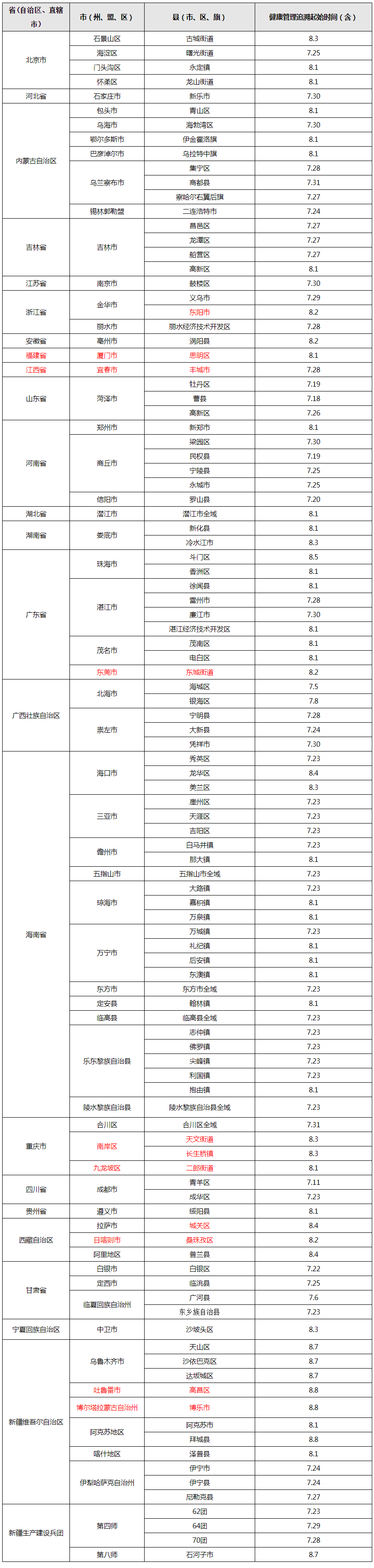 风险区域入(返)榕人员健康管理追溯起始时间一览表
