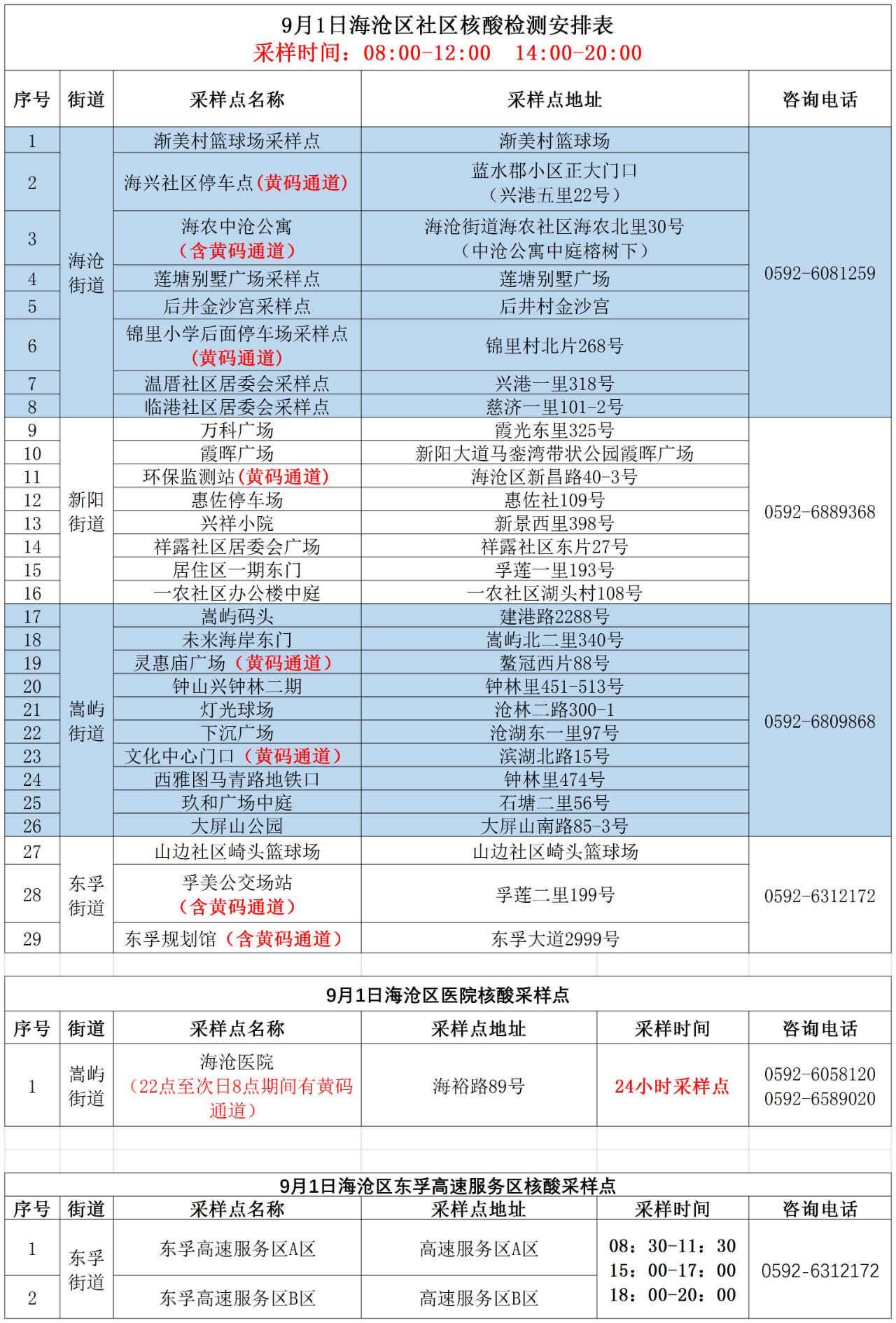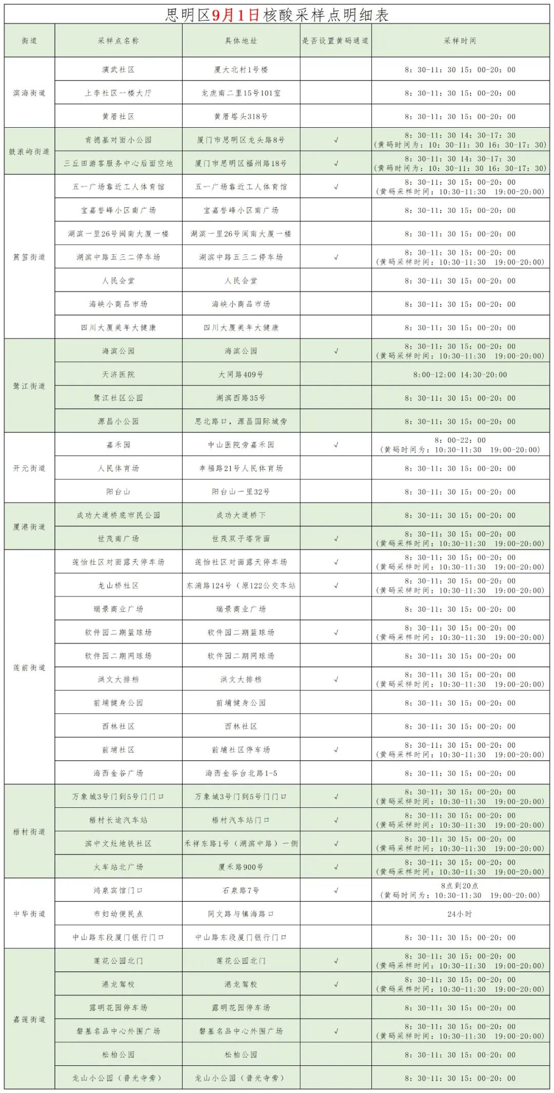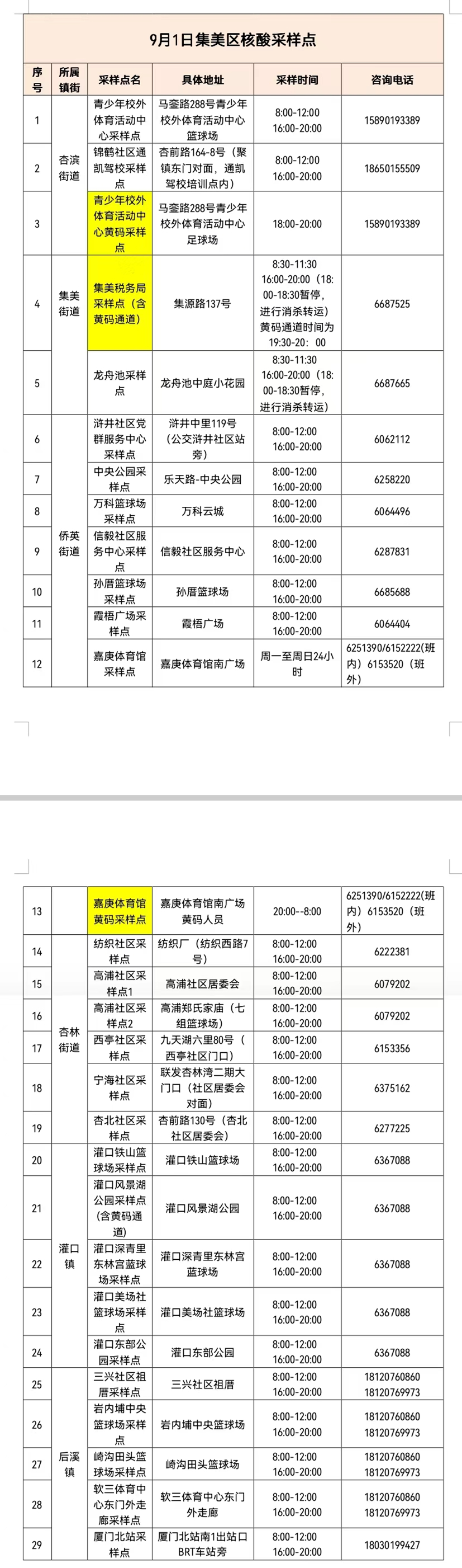 9月1日,翔安区于大嶝街道、金海街道、马巷街道集中开展核酸检测,以上镇街居民,可前往社区核酸采样点进行检测。
