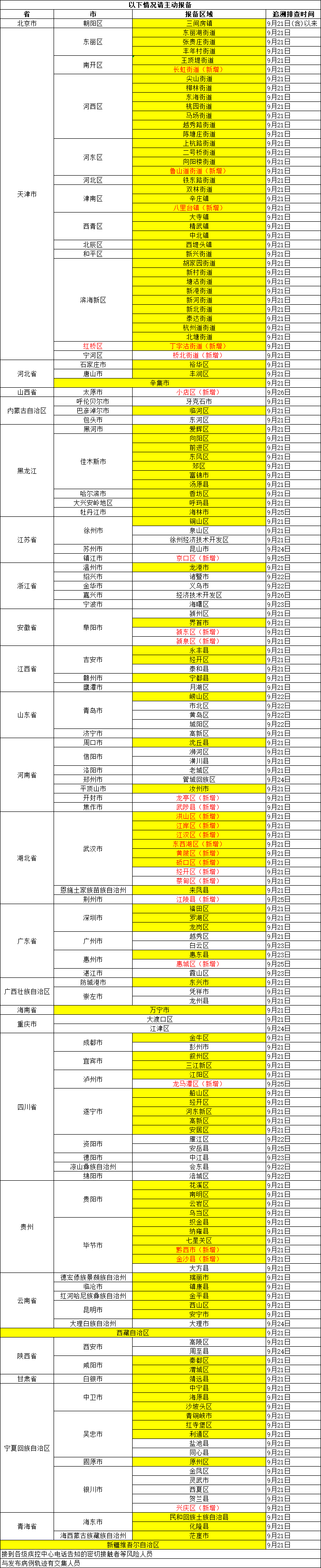 黄底为有中高风险区的城市(更新时间截至当日15时),中高风险区以国务院客户端实时更新为准。