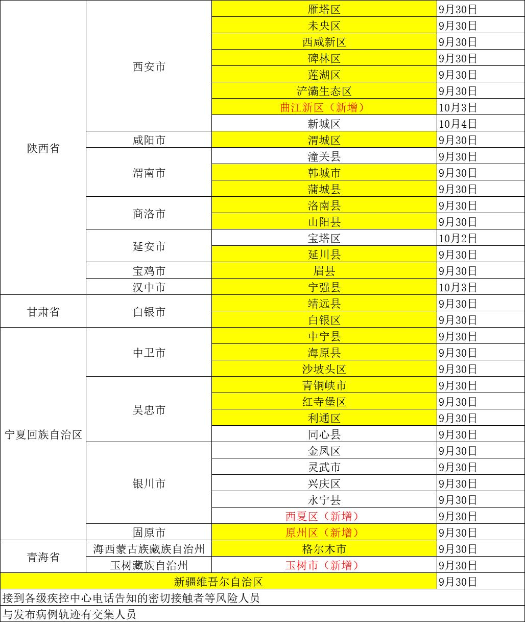天津滨海新区、武清区、河北张家口市、黑龙江鹤岗市、大庆市、上海浦东新区、江苏连云港市、湖南衡阳市、湘潭市、广东惠州市、海南海口市、四川宜宾市、成都市、陕西西安市、宁夏固原市等地根据《新型冠状病毒肺炎防控方案(第九版)》相关规定新增划定高、中、低风险区。