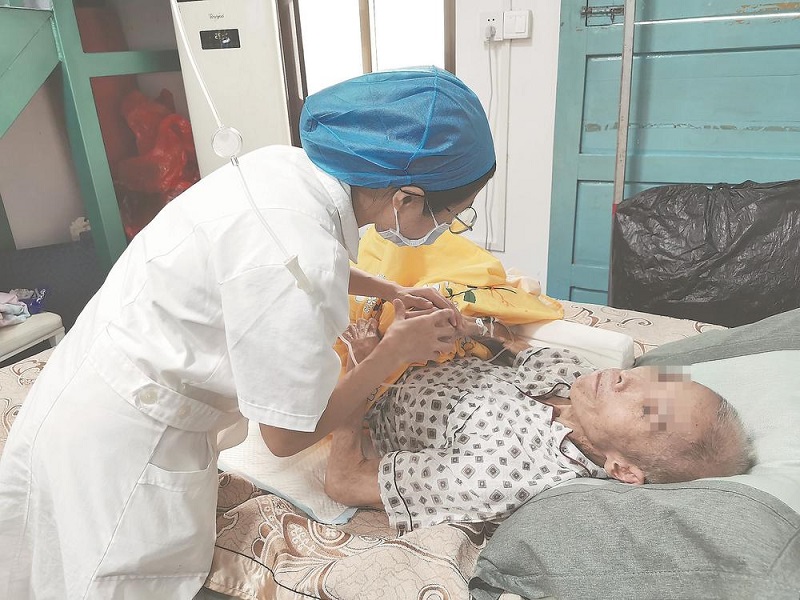 长乐区江田镇卫生院的家庭医生团队前往老戴家中评估后,认为老戴符合居家安宁疗护的条件。随后的一个月,卫生院护士谢小云和同事们轮流上门,给老戴静脉输液补充营养,指导他使用镇痛药物减轻癌痛,同时还指导家属给患者翻身、拍背,缓解褥疮。